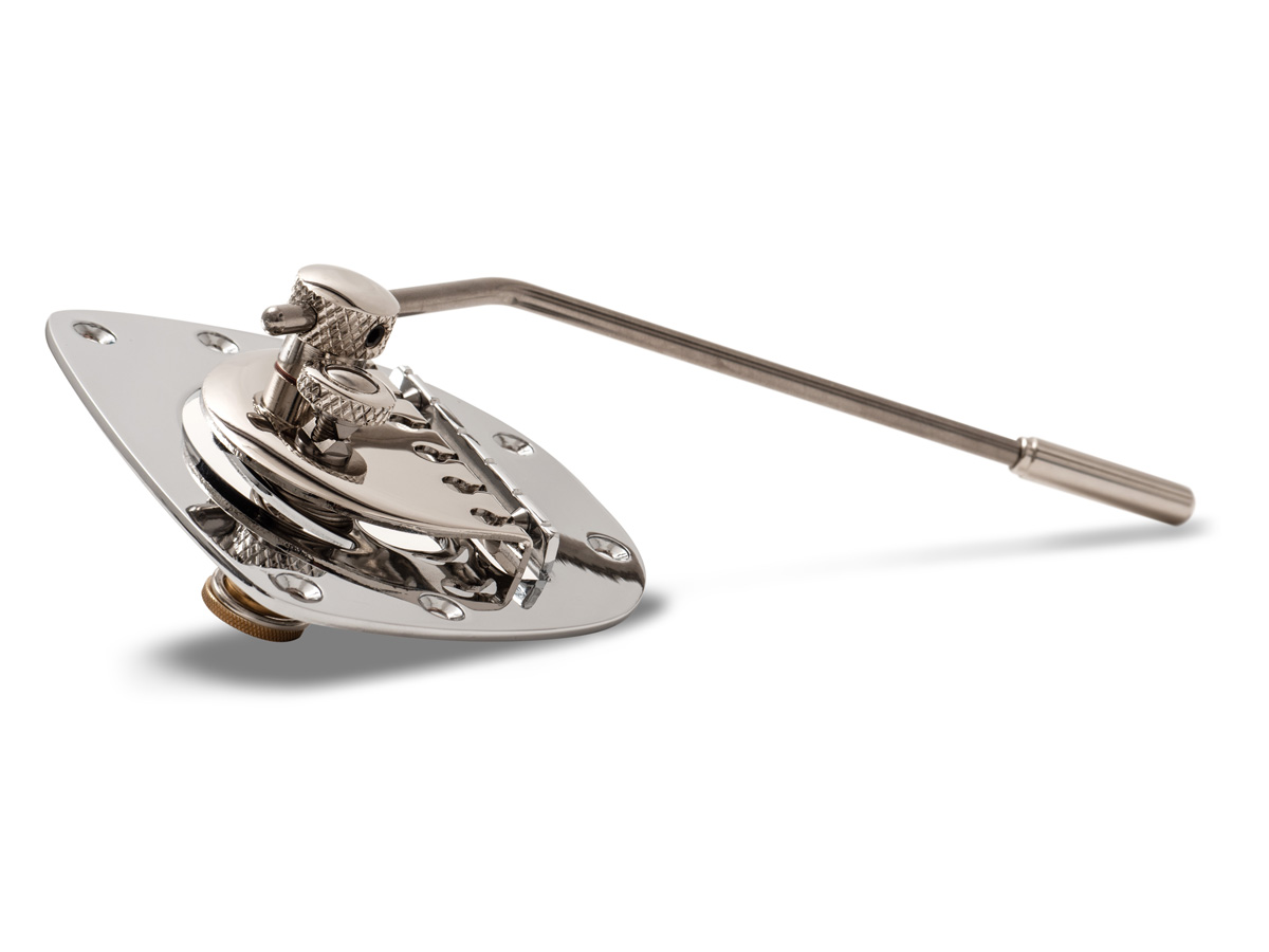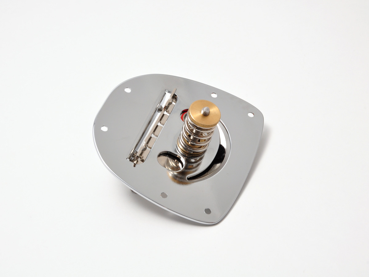 Our lefthand tremolo for Jazzmaster and Jaguar type guitars is the only one on the market that is technically not a copy of the Fender system, but can still be mounted 1:1 without milling, drilling and modifications and offers all the advantages of the göldo DG1 tremolo series: buttery smooth movement equally in the "up & down" operation including adjustable zero point by spring preload.